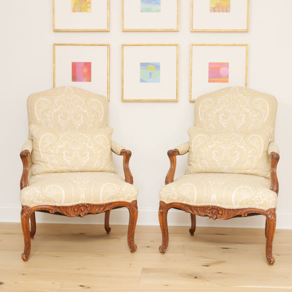 A beautiful pair of early 20th-century French carver chairs, dating to around 1920. These elegant armchairs retain their original frames, newly refurbished and upholstered in a neutral yellow damask to combine period character with modern comfort.