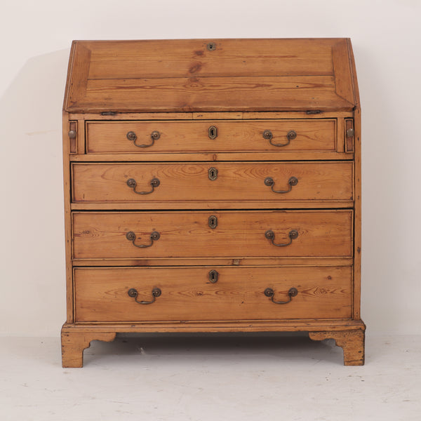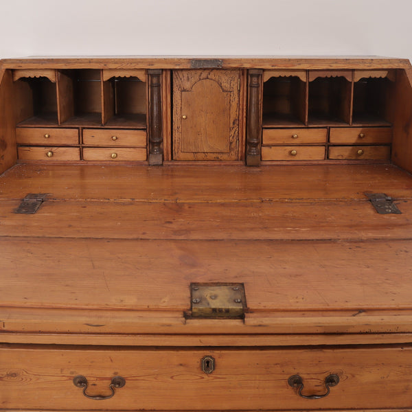 Beneath the fold-down desk are four full-width drawers with original brass pulls and escutcheons, offering generous storage space. The interior showcases fine period details, including turned columns and scalloped trim, all in keeping with 19th-century craftsmanship. Resting on bracket feet, this piece exudes rustic charm and timeless character—perfect for a study, bedroom, or entryway.