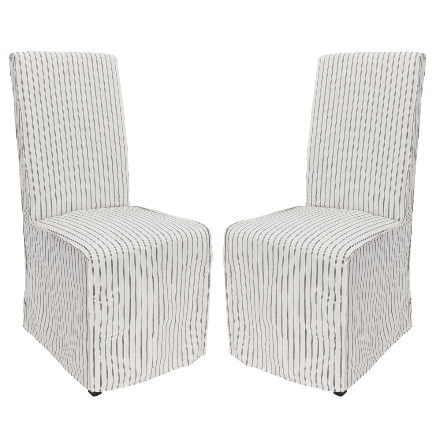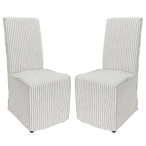 Our elegant slipcovered dining chairs have classic ticking covers, just right for your modern Farmhouse. Each order includes a pair of chairs.