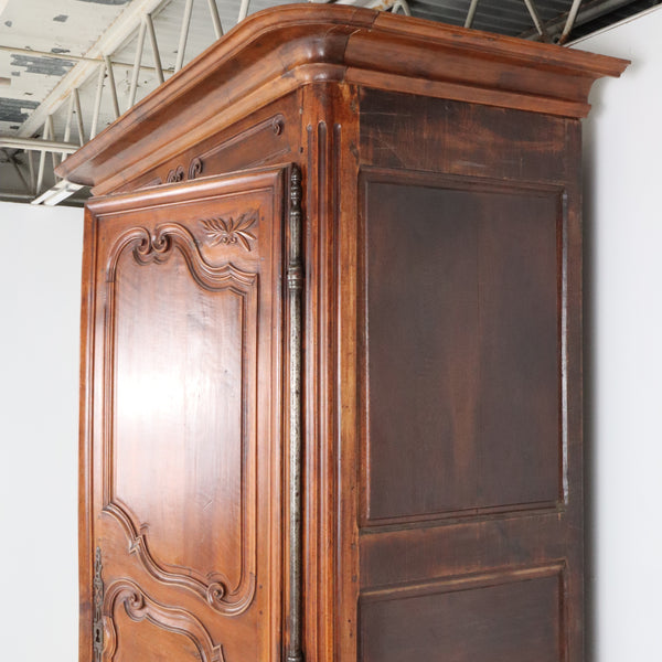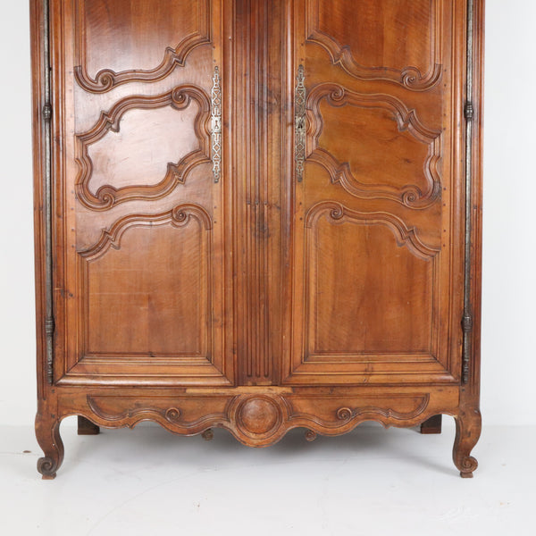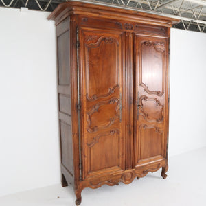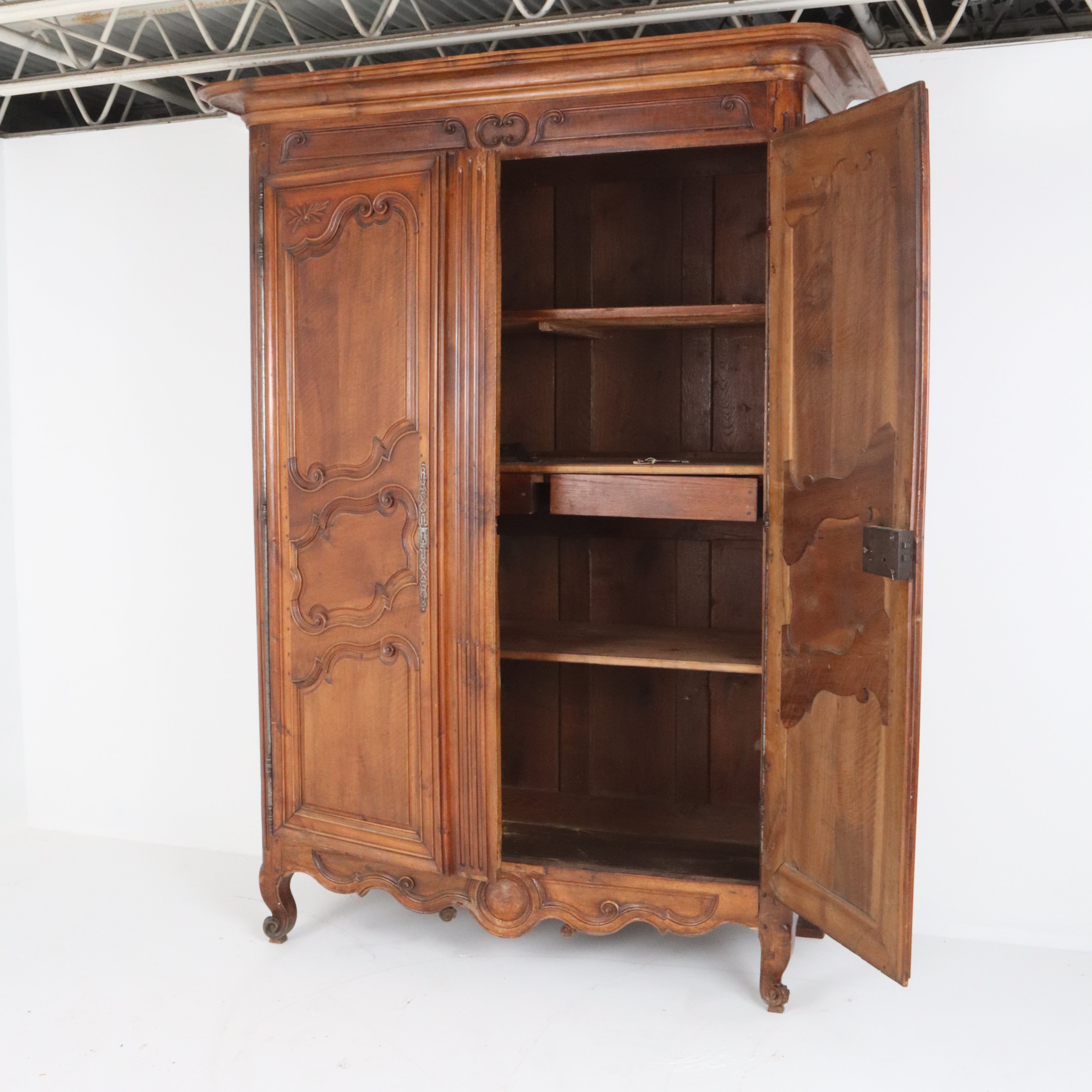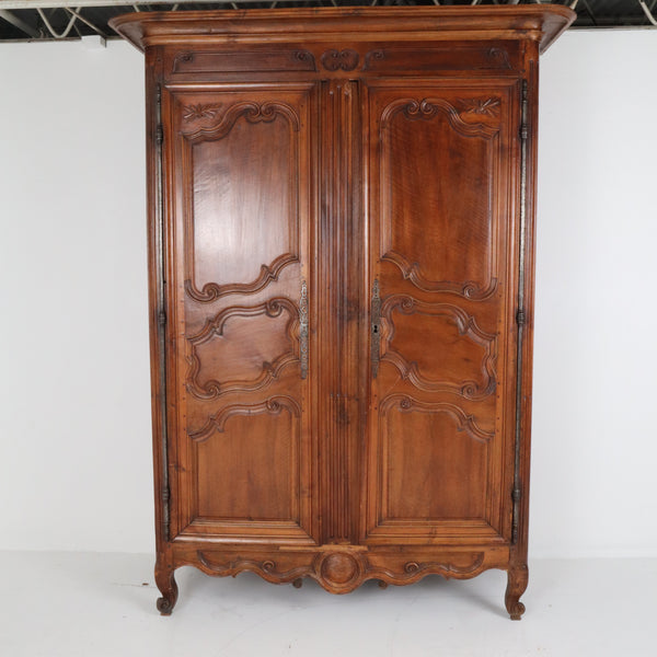 This two-door French armoire is a stately condition in any space. Its intricate doors and beautiful base prove its antiquity. With three shelves, this armoire is a great piece to provide storage and beauty.