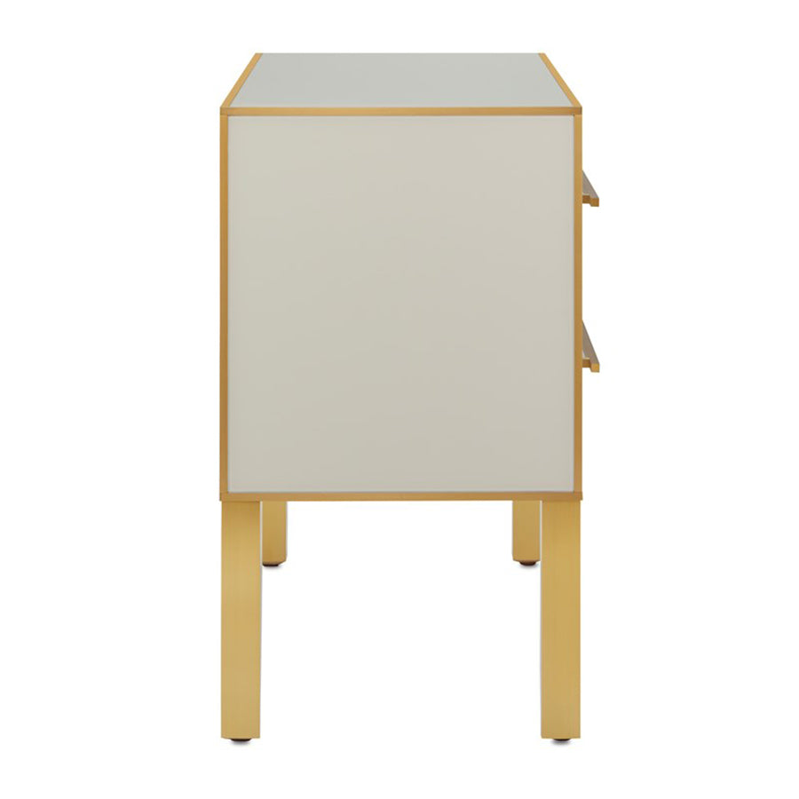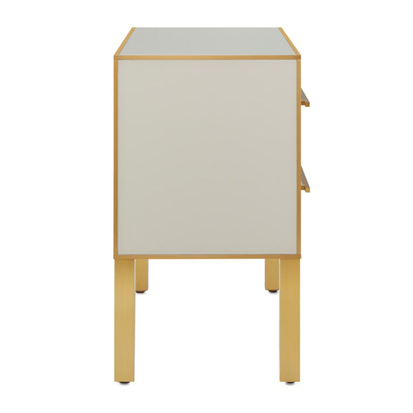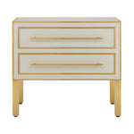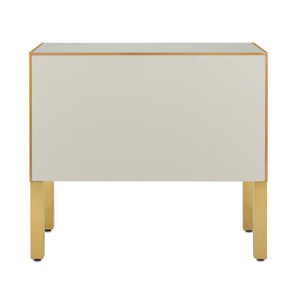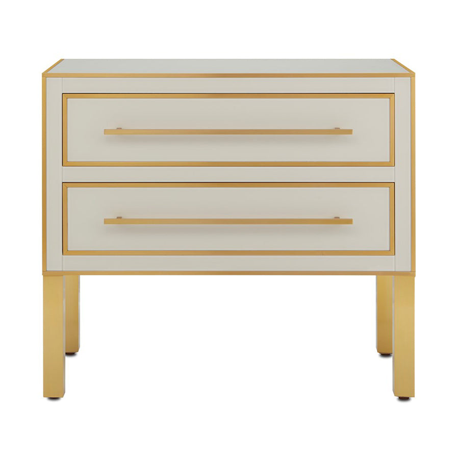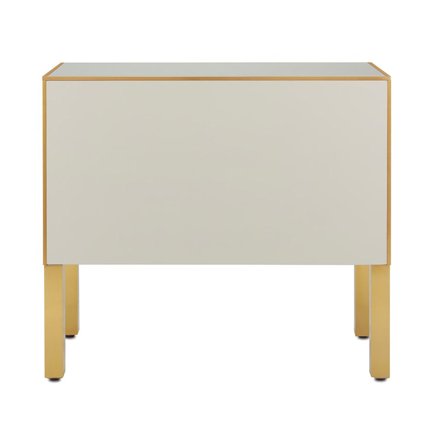 The Arden Ivory Chest is inspired by a 1970s reverse-painted glass antique our director of furniture Aimee Kurzner found at the Paris flea market. The chest features ivory reverse-painted glass panels on the top, front, and sides with solid brass trim, hardware, and legs. The ivory and gold chest has a beveled top, and drawers with soft-close glides. The Arden family of furnishings includes several beautiful pieces in pink and in ivory.