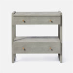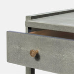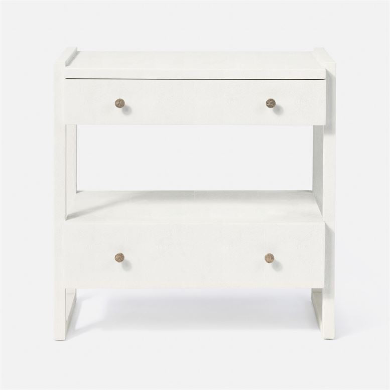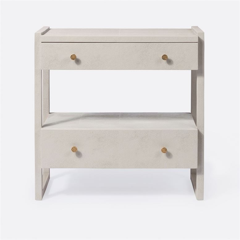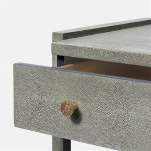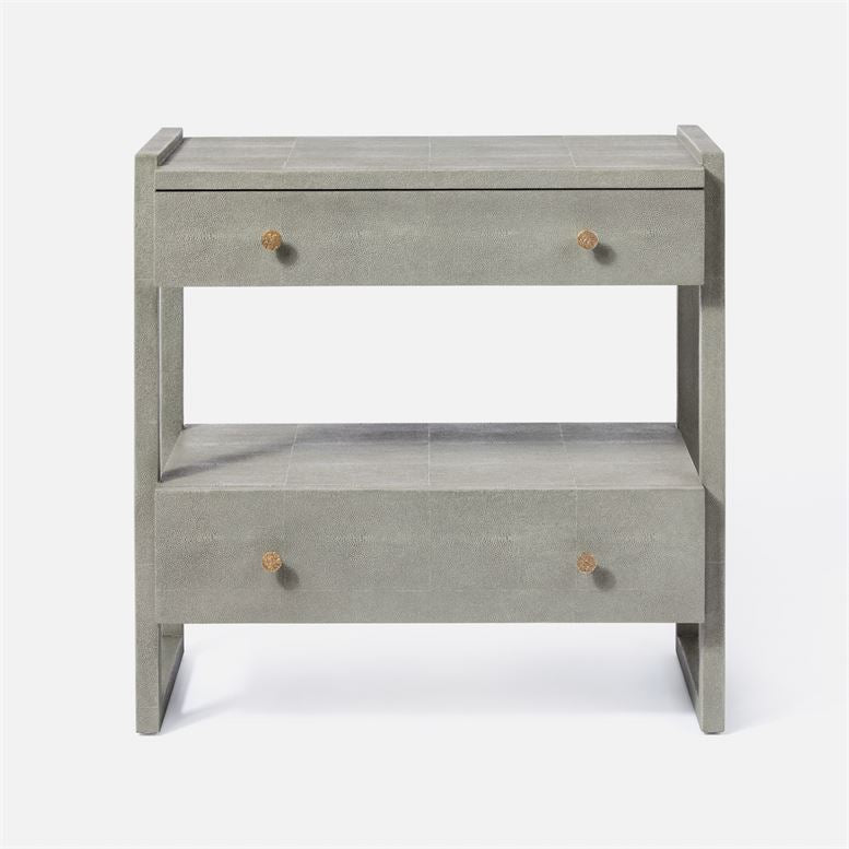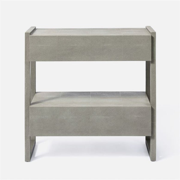 Add abstract shape and movement to a space with our newest collection of nightstands and dressers. With geometric framework and off-set drawers, each linear piece is meant to be seen from all angles. Three quiet colors of vintage faux shagreen complement the minimalist vibe of this extraordinary collection.