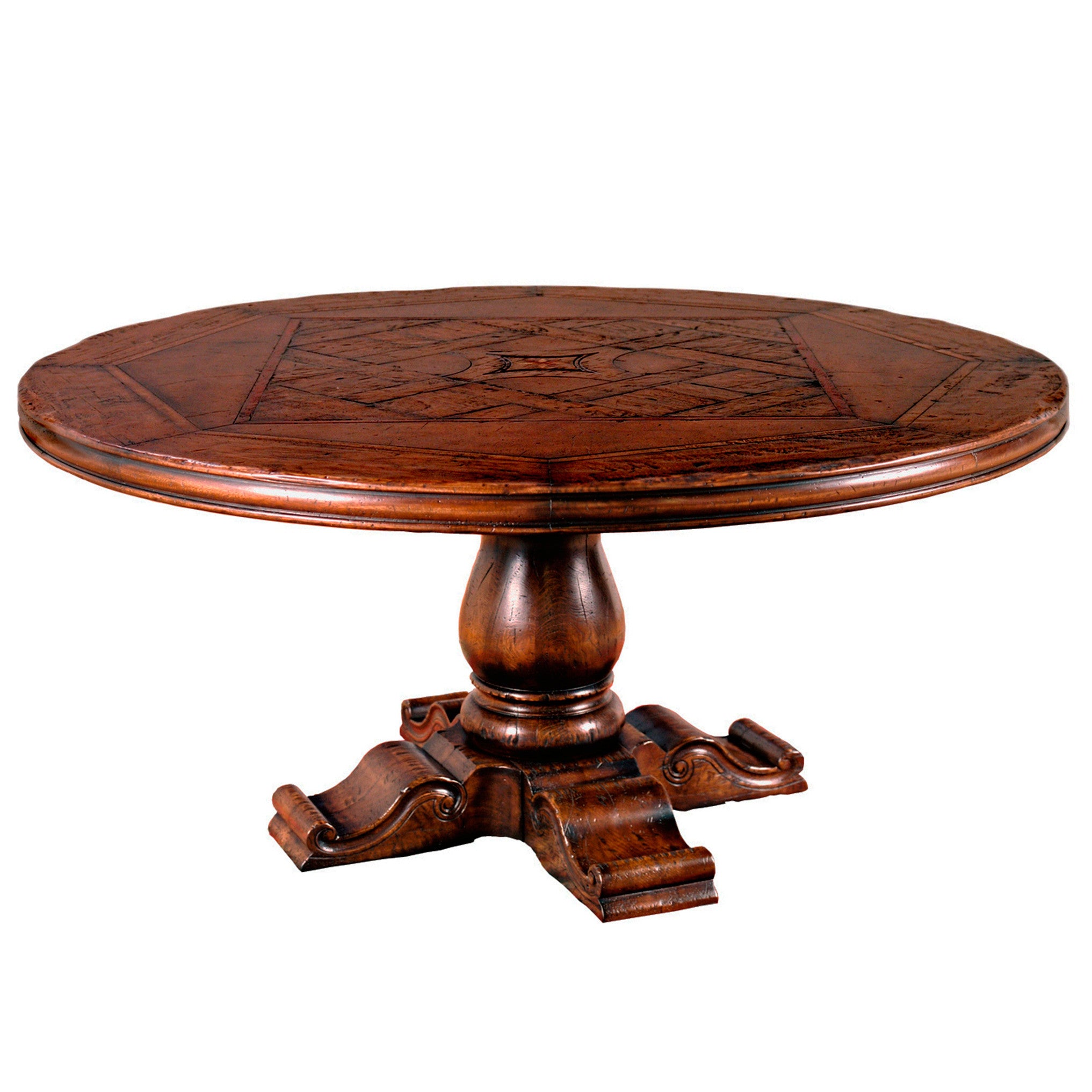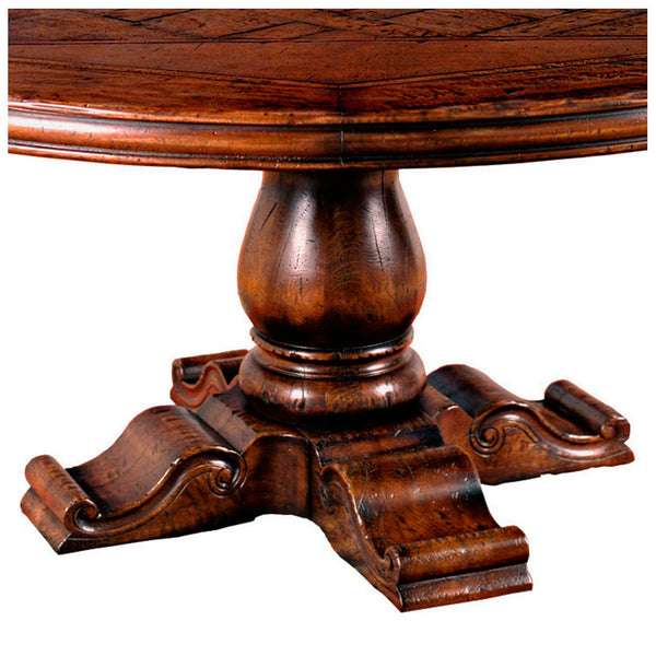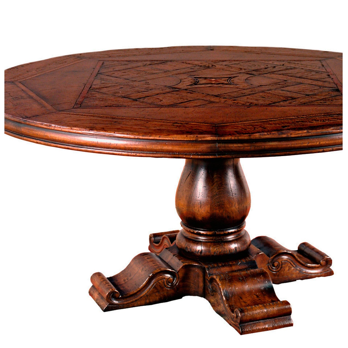 This beautiful French pedestal table has an oak and burl wood parquet top.