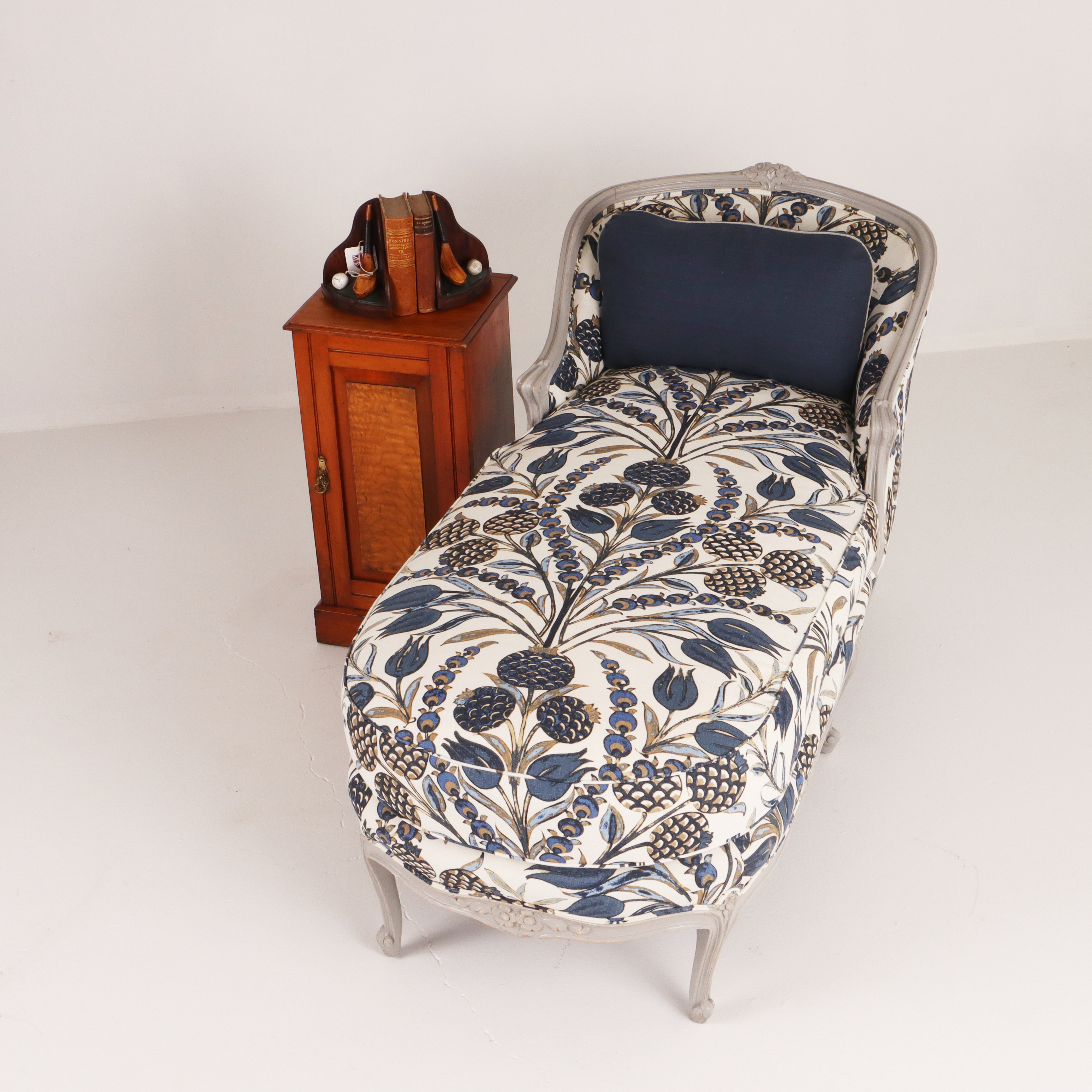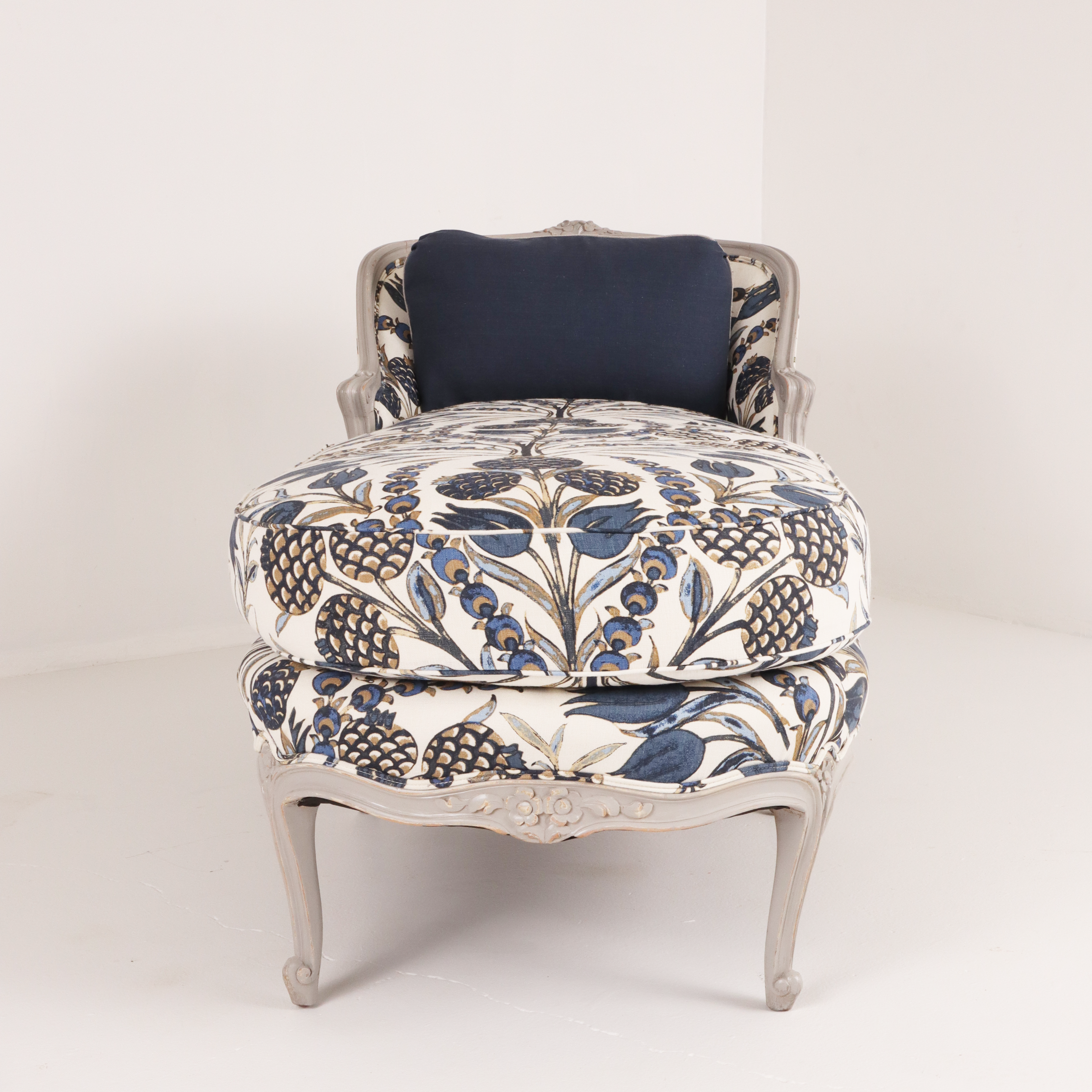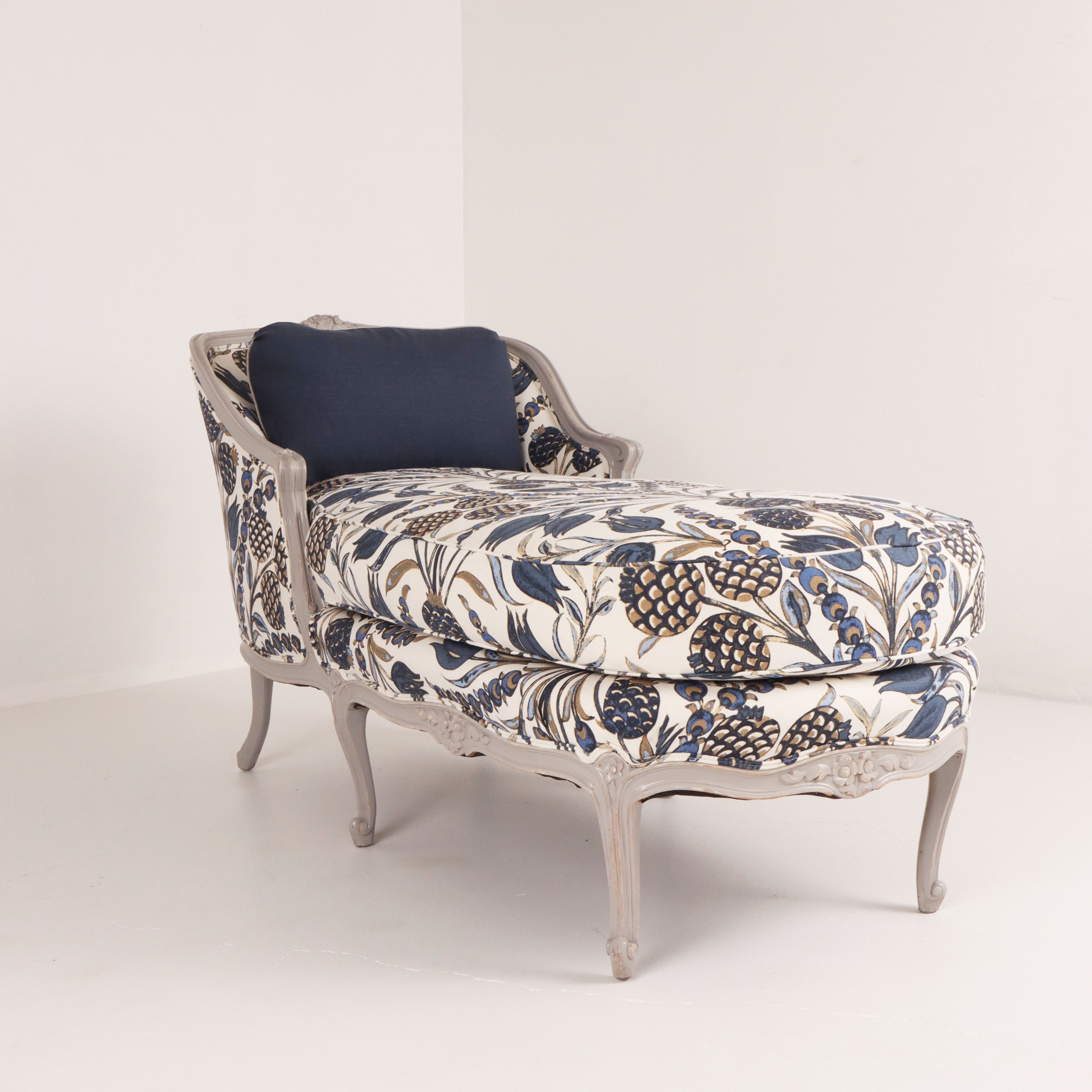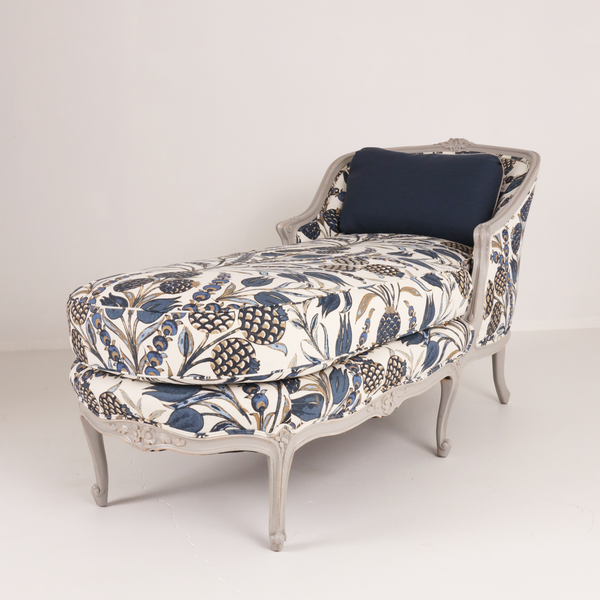 French Antique Chaise Lounge in Thibaut Cornelia Navy Fabric