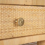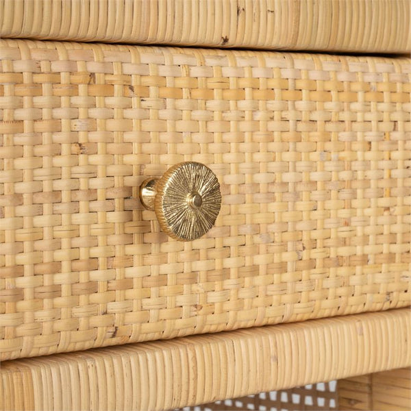 A tightly wrapped, natural peeled rattan frame complements the dense basket weave of the natural peeled rattan top, side, and double shelves. The soft-close drawer is finished with a wood interior and flower-patterned gold knob.