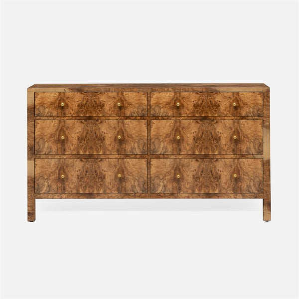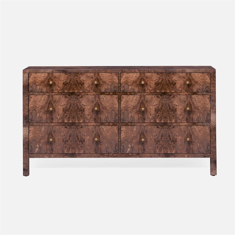 Straightforward silhouettes let vibrant patterns become the focal point of each dynamic piece of the Lindsey collection. Detailed variation highlights burled wood veneer, and faceted brass hardware adds a polished touch.