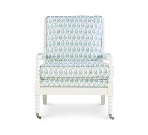 Shown in Rave Seaglass fabric with Chantilly wood finish. Also available in Glasgow Alabaster performance fabric and Seal wood finish.