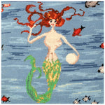 Fun, whitty red-headed mermaid is swimming playfully in the deep blue waters of the sea. She is surrounded by her friends.