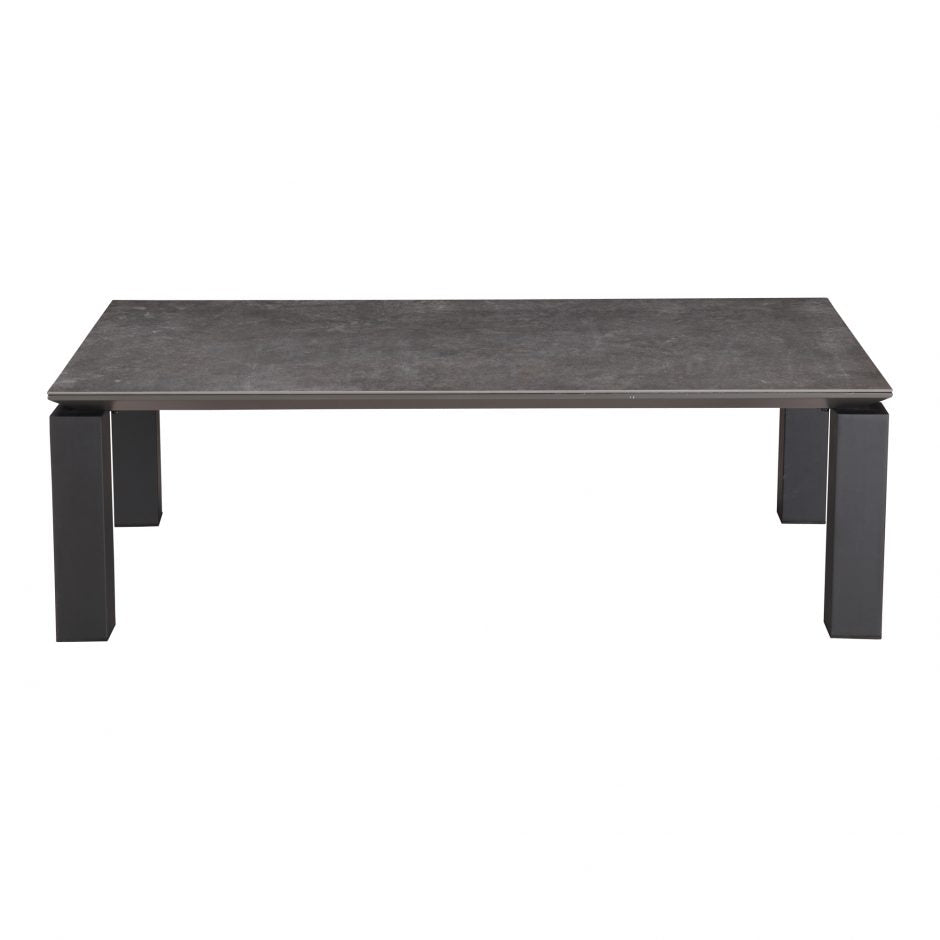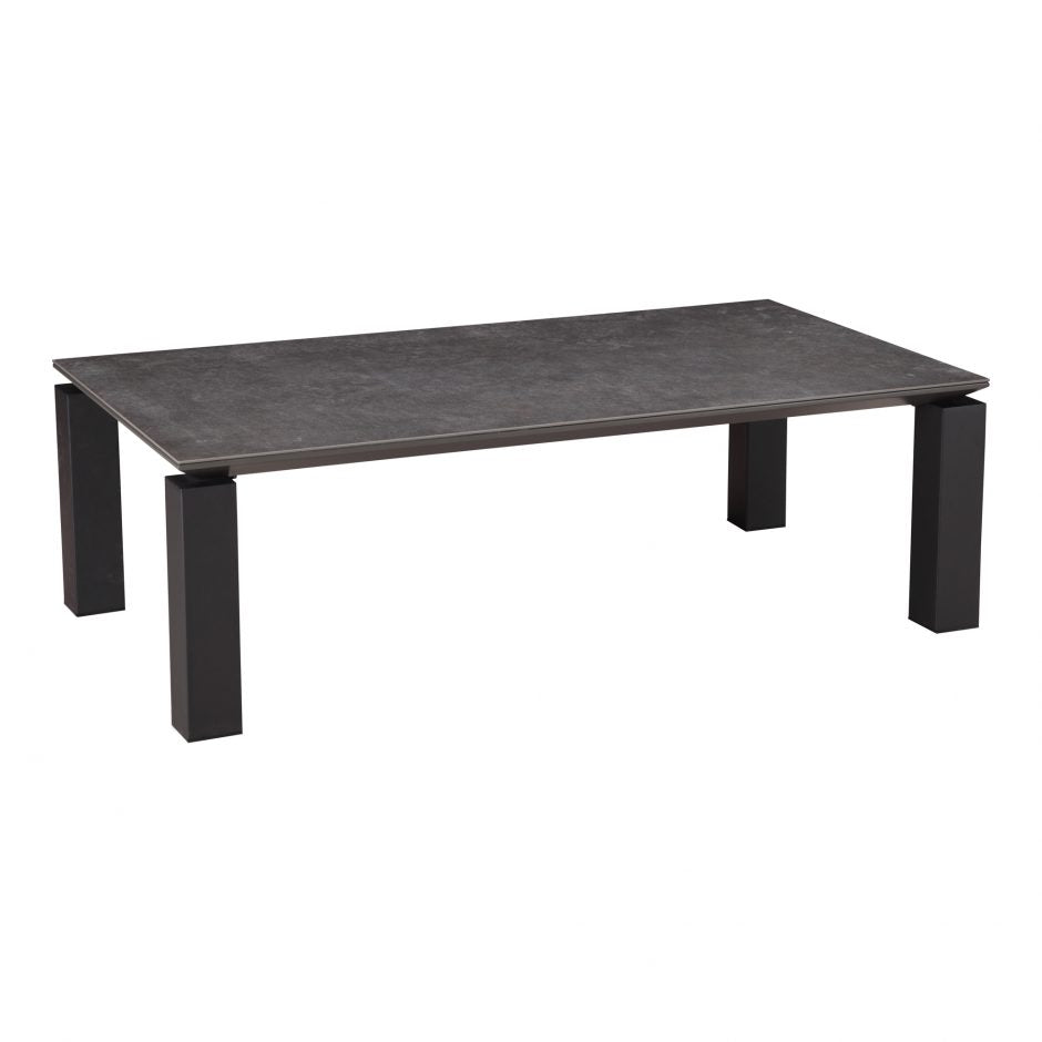 The Mimi Coffee Table features a beveled, ceramic top, set on iron legs for a modern look.