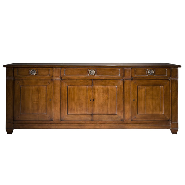 Has 3 drawers, 4 doors, and 1 shelf on each side of the central split.